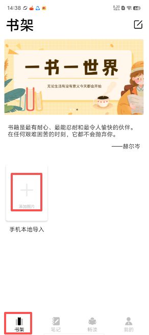 1、打开软件进入到“书架”页面,找到页面上的“+”。
