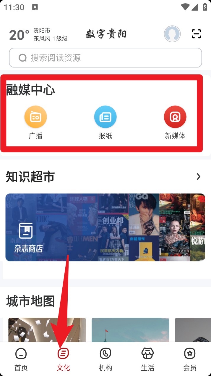 2. 点击下方导航栏的文化图标,可进入融媒中心、知识超市、城市地图等文化资源专区。
