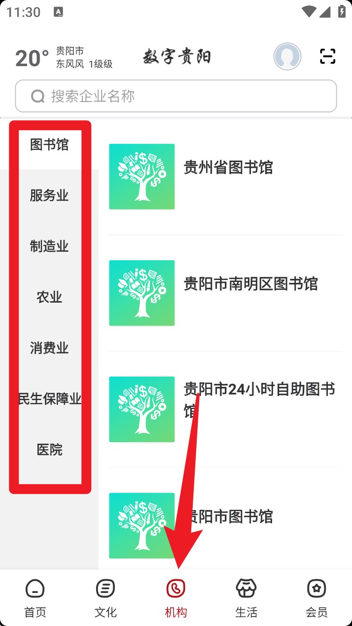 3. 切换至机构页面,通过左侧行业分类栏可查找图书馆、服务业、医疗单位等实体机构信息。