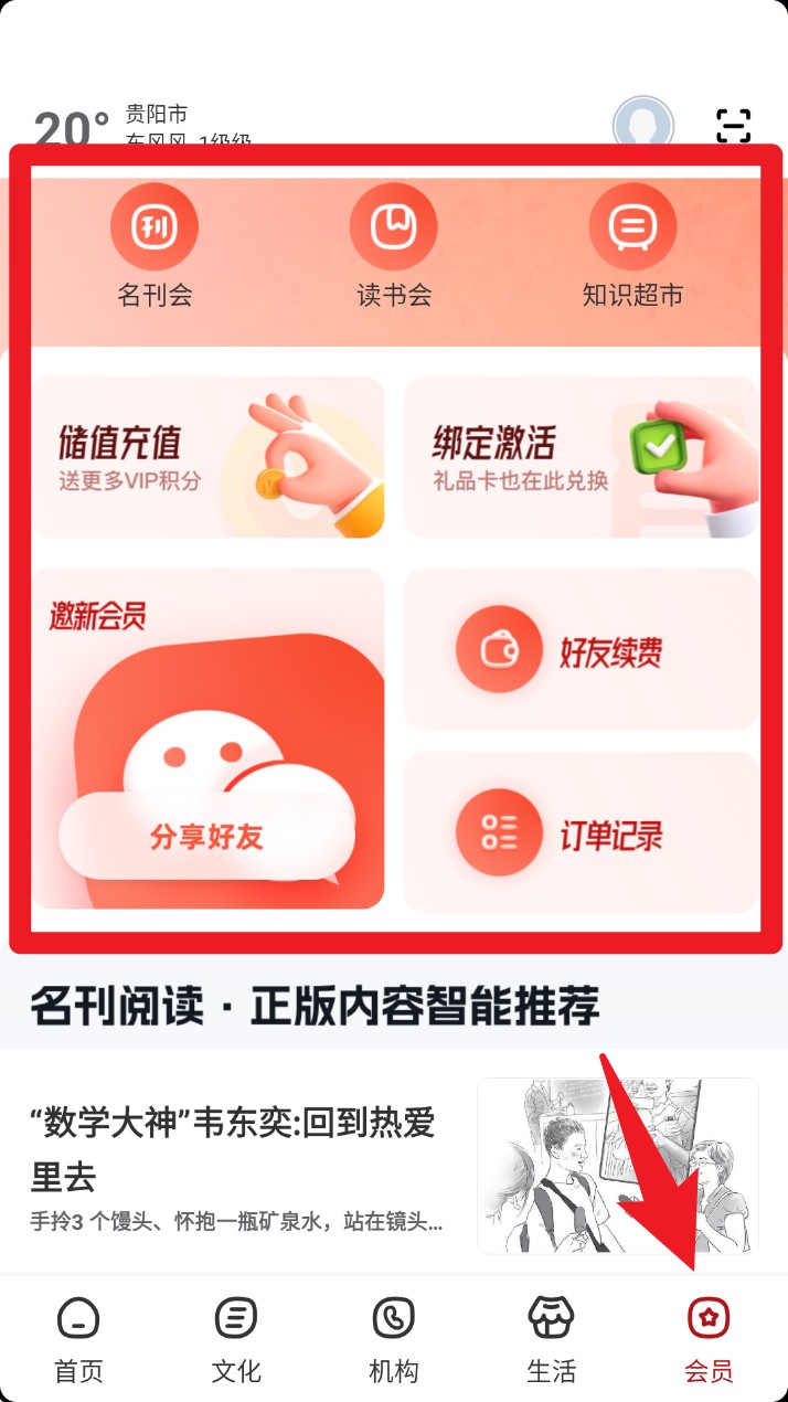 5. 点击会员页可参与名刊会、读书会,查看订单记录、续费会员,还能邀请好友领取专属奖励。