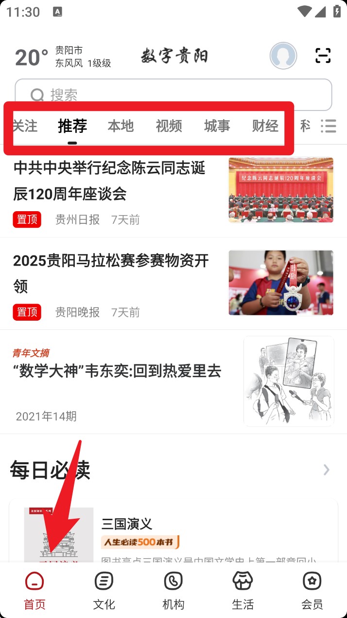 1. 打开App后默认进入首页频道,左右滑动可切换推荐、本地、视频、城事、财经等资讯内容分类。
