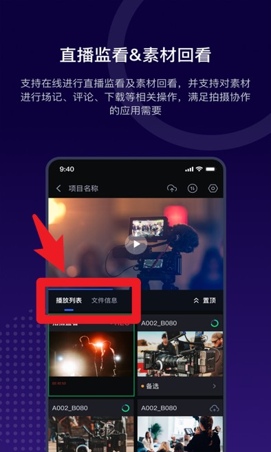 2、云端素材审阅:拍摄内容自动同步至云端存储,支持在线预览已录制素材。可进行场次标记、质量评级等标准化场记操作。