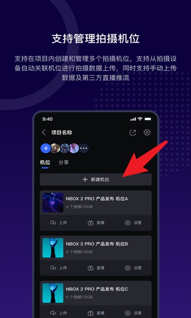 4、在项目中可创建和管理多个拍摄机位,实现设备自动识别和手动上传素材及直播功能。