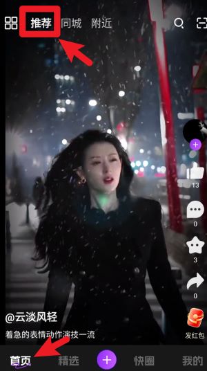 2、登录后自动进入首页推荐内容,可上下滑动观看短视频,点击右侧图标进行点赞、收藏和分享。