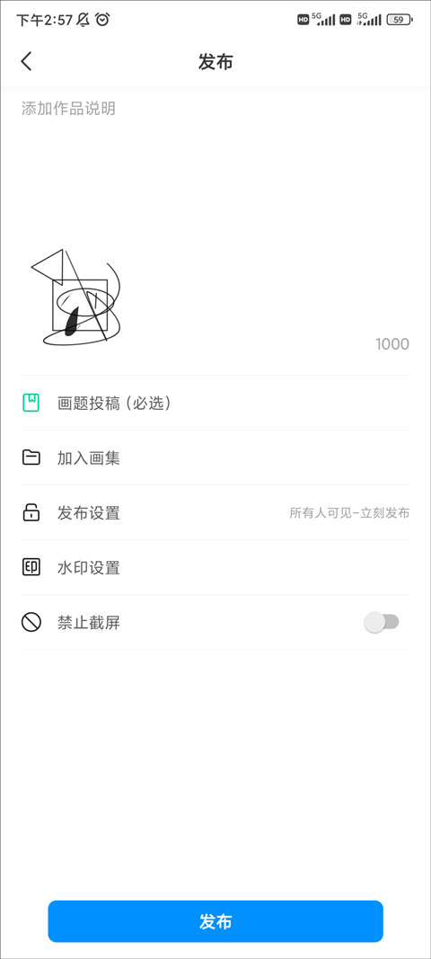 3、点击打开后就能进入发布界面,在这个界面里,你需要添加作品说明,同时还能使用画题投稿说明、发布设置、水印设置等功能进行相关配置。