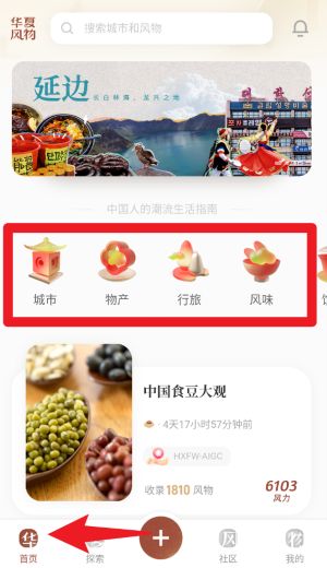 1、进入首页后,您可以浏览风物推荐内容,借助顶部分类能够快速切换城市、物产、行旅与风味等不同主题。