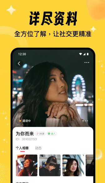 2、个人资料 用户可对个人资料进行编辑,上传照片、语音介绍等内容,以便让他人更好地了解自己。
