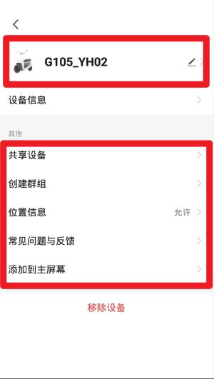 1、进入设备设置页面能够查看车辆编号,还可以修改名称、共享设备、设置位置权限以及移除当前车辆。