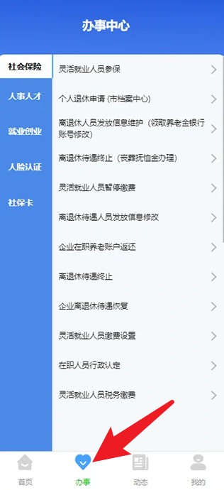 2.点击底部办事按钮,进入办事中心,根据类别选择社保、人事、就业等服务。