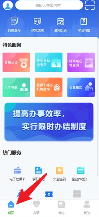 1.打开应用默认进入首页,可通过顶部搜索栏快速查找相关政务服务内容。