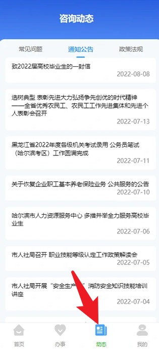 3.点击动态栏目可查看通知公告、常见问题和政策法规等最新资讯内容。