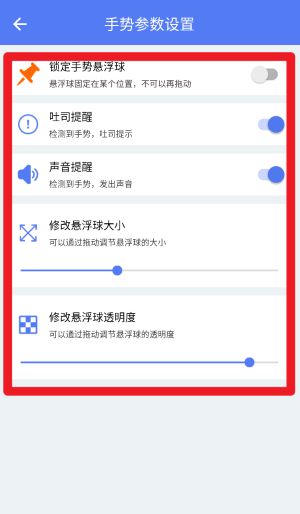 3、在手势参数设置中可以调整浮球大小与透明度,并可启用语音提示及吐司提醒等反馈方式。