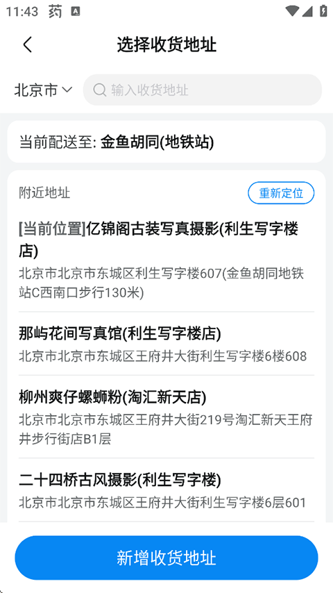 2、通过搜索定位您当前所在位置来确认配送地址,也可以新增一个收货地址;
