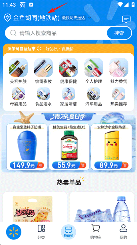1、打开沃尔玛App网上购物商城,点击首页左上角的定位按钮进入;