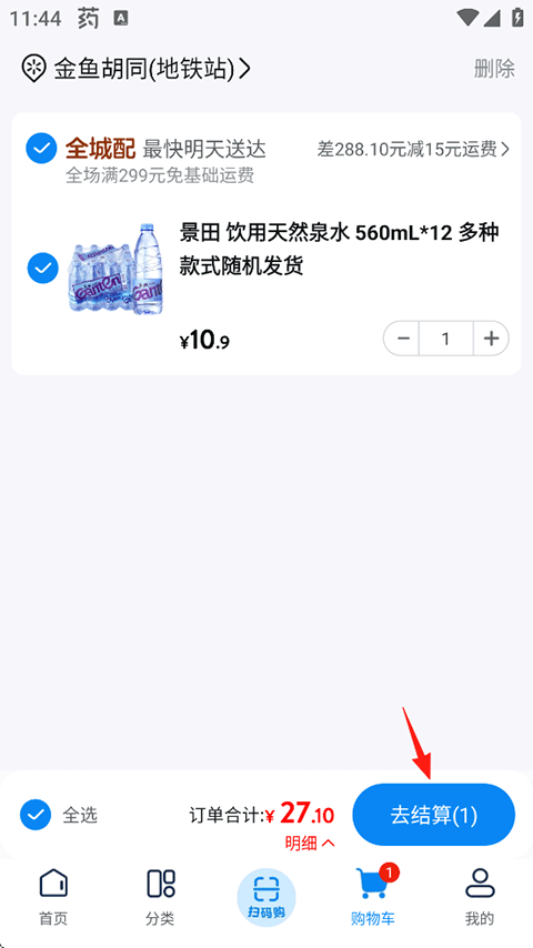 6、点击“购物车”确认要购买的商品,之后点击“去结算”;