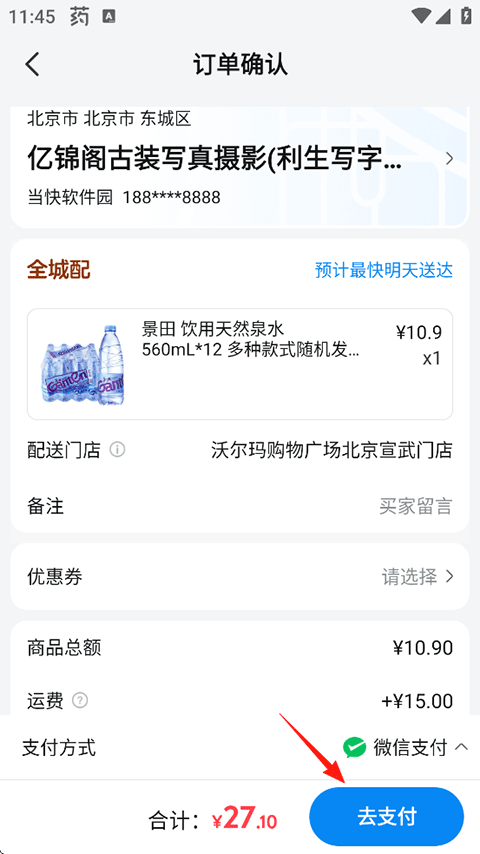 8、确认信息无误后点击“去支付”,付款下单;
