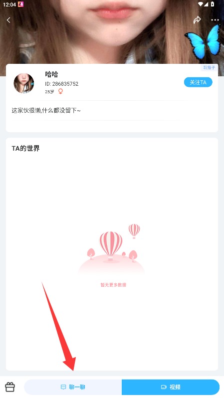 4、进入用户主页后点击底部聊一聊按钮,即可发起私聊对话开始交流互动。