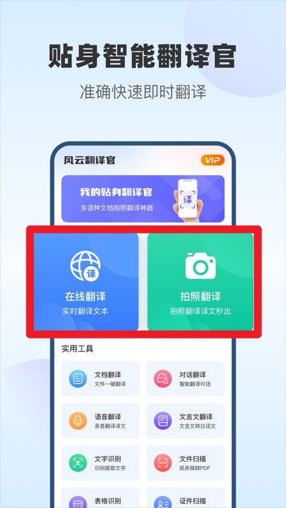 1、首页提供在线翻译与拍照翻译功能按钮,支持实时翻译文本和图片翻译提取文字内容。