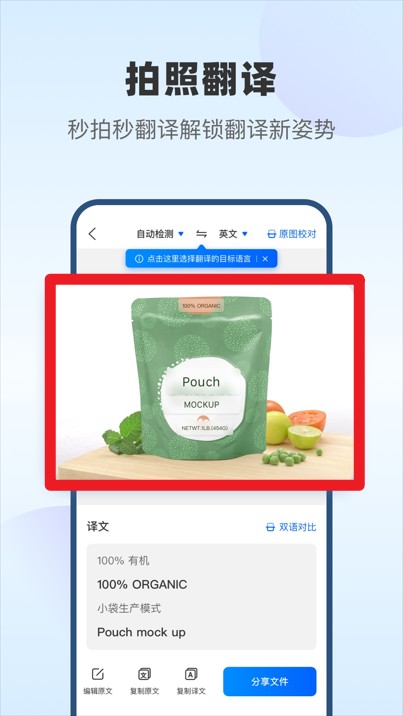 3、拍照翻译功能支持识别包装、文件等图像内容,自动识别并翻译为所选语言。