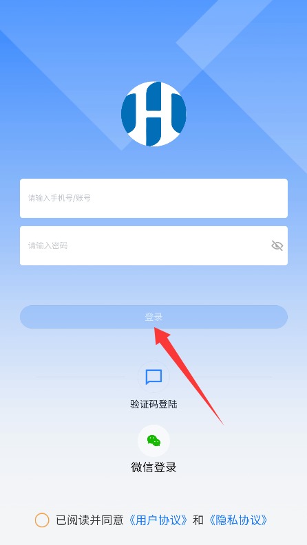 2、在登录界面输入手机号和密码,勾选同意相关条款后点击登录按钮进入应用。