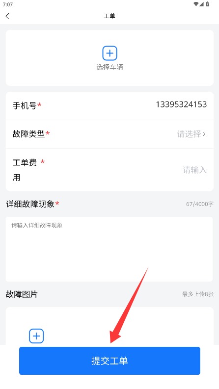 4、完善车辆信息、联系方式、故障描述等内容,上传相关照片视频后提交工单申请。