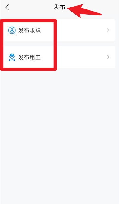 3、点击中间去发布图标后,选择发布求职或发布用工进行的信息发布。
