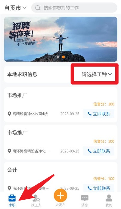 1、点击底部求职按钮可查看本地招聘信息,选择工种筛选职位并快速联系雇主。