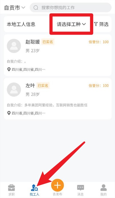2、切换至找工人栏目后,可浏览工人信息列表,按工种选择合适的劳动力。