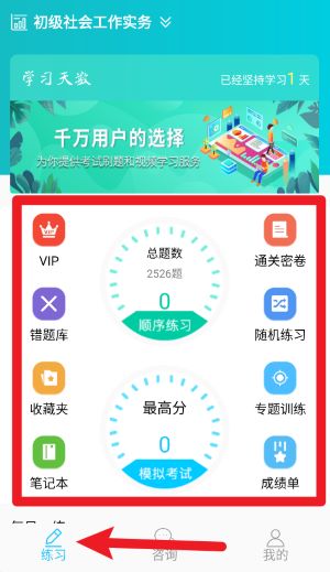 2、在练习页面里,你能够进入顺序练习、模拟考试、错题库等不同模块,开展具有针对性的刷题训练。