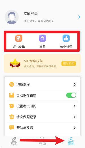 4、在“我的”页面中,用户能够使用证书查询、联系客服和评价功能,还可以设置考试时间以及清除历史记录。