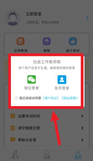 1、首次使用时,需先选择微信登录或账号登录方式,并勾选同意用户协议与隐私政策,之后方可继续后续操作。