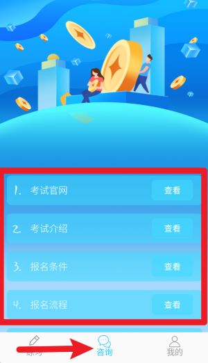 3、点击底部的咨询按钮,即可查看考试、考试介绍、报名条件及报名流程等相关信息。
