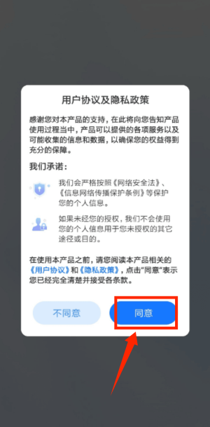 在用户协议与隐私政策的弹窗中点击“同意”按钮,就能进入应用。