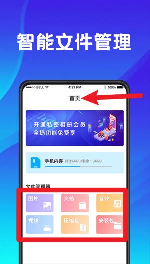 1、进入首页即可快速查看图片、文档、音效、视频等六类文件,实现智能化统一管理。