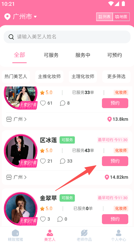 2、在筛选条件确认无误后,浏览美艺人的列表,查看其评分、已服务单数、距离等相关信息。