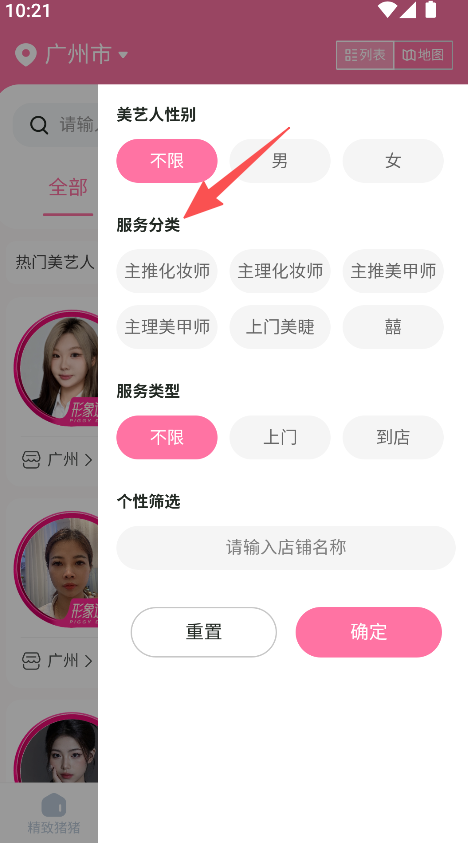 1进入美艺人相关界面后,先选定所在区域,再对美艺人的性别、服务类别等筛选维度进行设置。