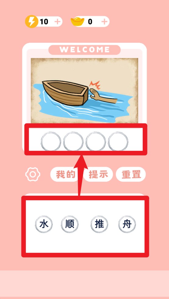 1、按照图片给出的提示挑选成语,要按照顺序点击下方的文字来组成正确的答案,例如“顺水推舟”。