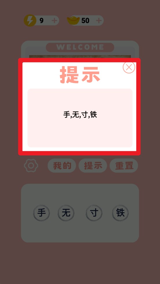 3、点击“提示”按钮后会弹出关键字,帮助用户快速猜出正确答案。