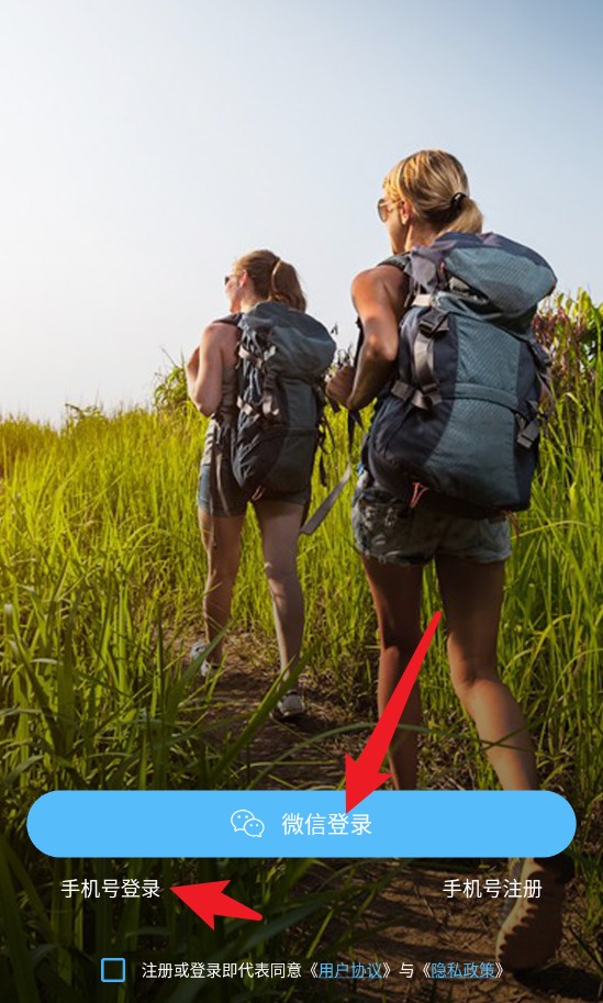 1、登录界面支持手机号或微信快速登录,注册即表示同意相关协议条款。