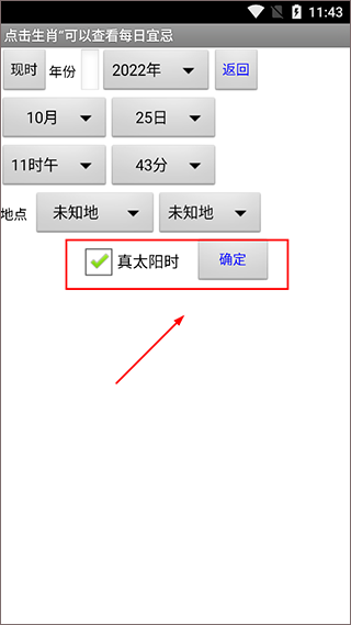 4该软件具备真太阳时日历显示功能,用户可点击“时间”选项调出输入窗口,选定具体地点后勾选“真太阳时”选项即可启用此功能。