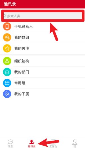2、在通讯录页面中可以通过关键词搜索人员,并快速访问组织结构、我的群组及常用联系人列表。