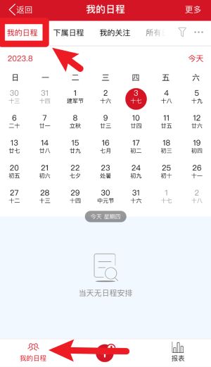 3、打开我的日程界面后可通过日历视图查看每日安排,并支持查看下属与关注对象的日程计划。