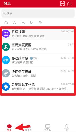 1、点击底部消息按钮可查看包括日程提醒、协作参与、密码变更等在内的各类系统通知信息。
