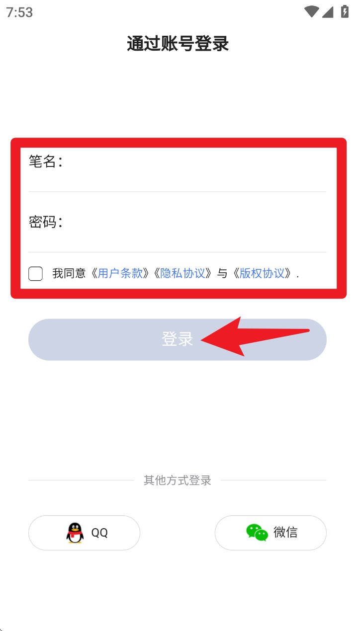 1. 启动App后进入登录界面,输入笔名与密码并勾选相关协议,确认同意后点击登录按钮,此外也能选择通过微信进行快捷登录。