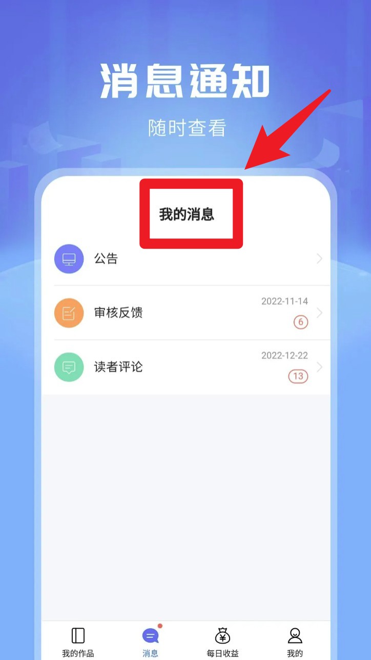 4. 当收到消息提醒时,您可以点击消息标签页,进入“我的消息”页面,查看审核反馈、公告更新以及读者评论,以此确保不会错过任何重要通知。