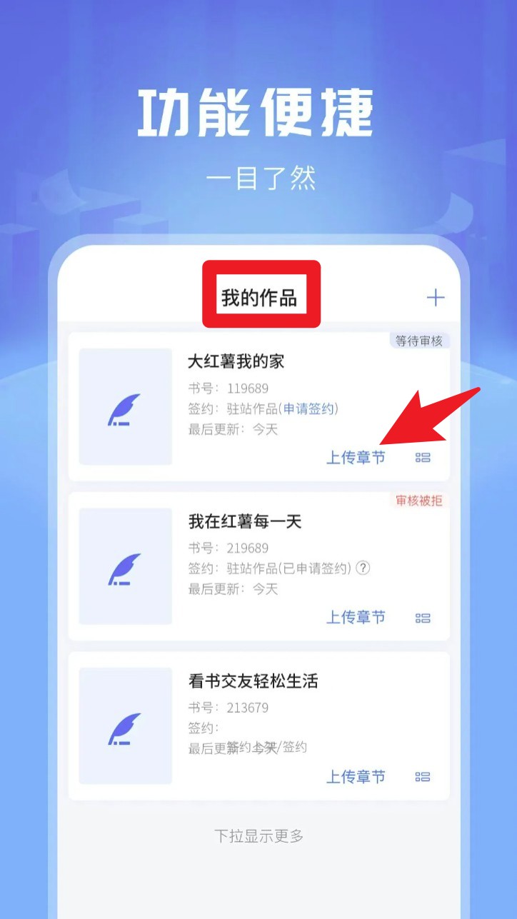 3. 点击底部的“我的作品”模块,能够查看作品列表、更新状态以及签约情况,同时还支持上传新章节以开展持续创作。
