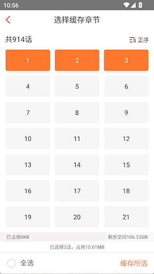 3、选择章节后点击“缓存所选”即可
