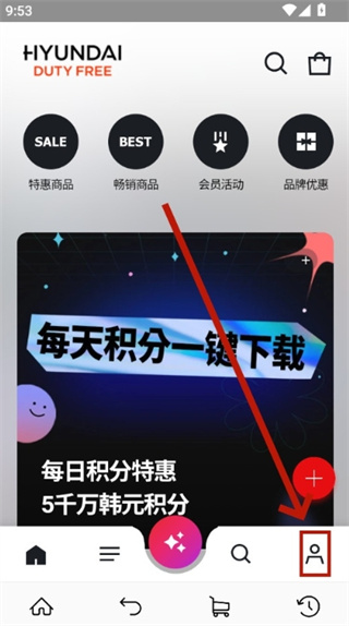 1、第一步是打开现代百货免税店的主页,接着点击页面右下角的“我的”按钮。