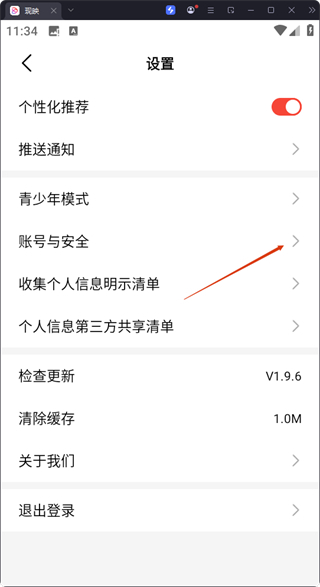 2、进入设置界面后,点击【账号与安全】选项,就能进入账号安全相关界面。