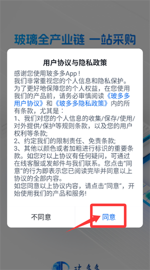 1打开玻多多APP,在弹出的用户协议确认窗口中勾选同意相关条款以进入下一步操作。